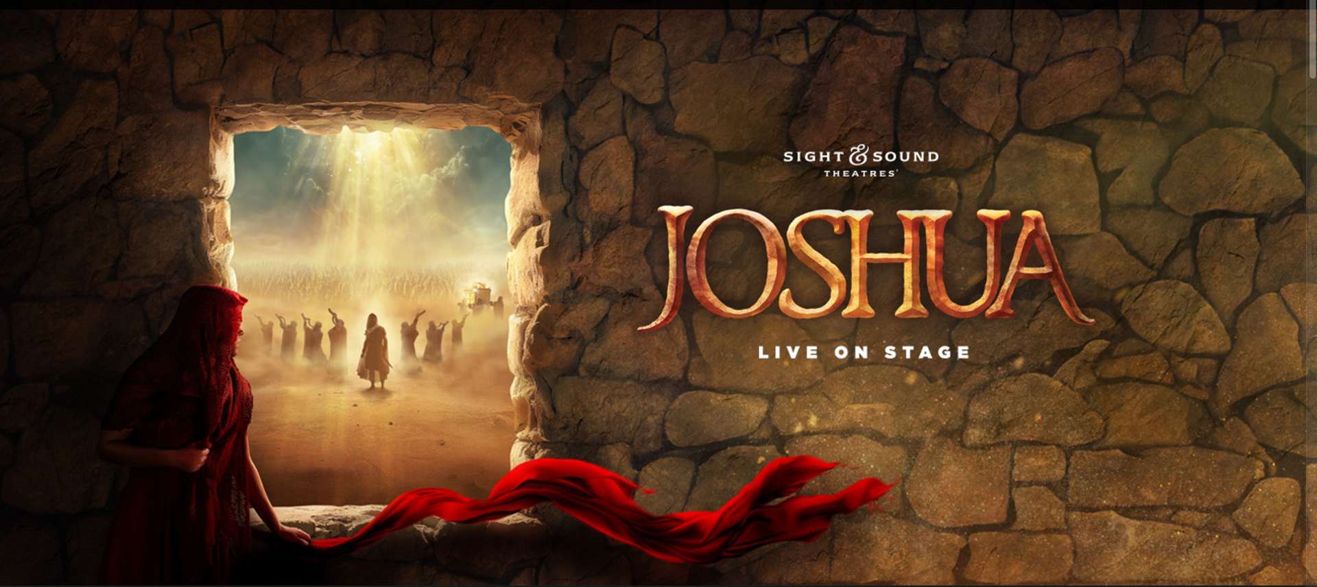 BE STRONG AND COURAGEOUS! From the banks of the Jordan River to the towering walls of Jericho, JOSHUA is a miraculous adventure for the whole family. Journey alongside the people of Israel as they navigate their new-found freedom in an unforgiving wilderness. When Joshua is called to replace Moses as their faithful leader, tensions mount in the midst of dwindling supplies and approaching armies. With one last fortified city standing between the Israelites and the Promised Land, unexpected help emerges from behind enemy lines and Joshua’s trust in God’s plan is put to the ultimate test. Experience one of the most redemptive stories of the Bible as it comes to life in this brand-new original stage production from Sight & Sound Theatres.
